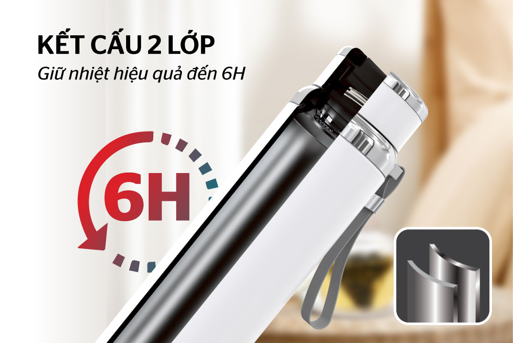Cấu tạo 2 lớp cách nhiệt tốt, giữ nhiệt lâu lên đến 6 giờ, rất phù hợp cho mọi đối tượng từ học sinh, sinh viên, dân văn phòng đến người thích thể thao.