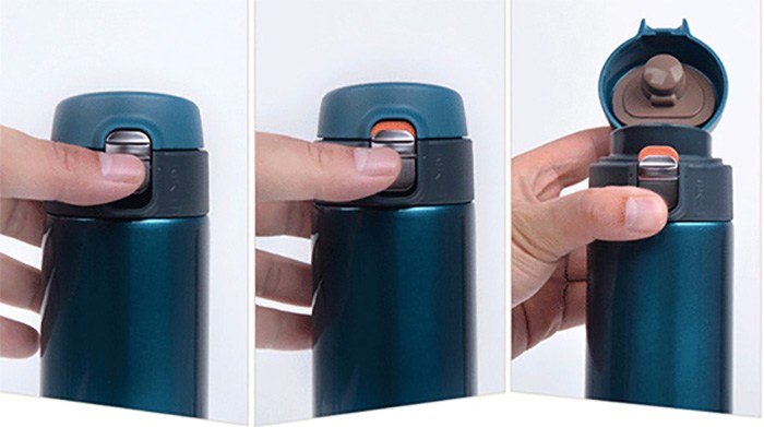 Mở nắp đơn giản bằng nút bấm chỉ với 1 tay. Nắp có khóa dạng trượt, chức năng này giúp ngăn nắp vô tình mở trong túi dẫn đến làm đổ đồ uống.