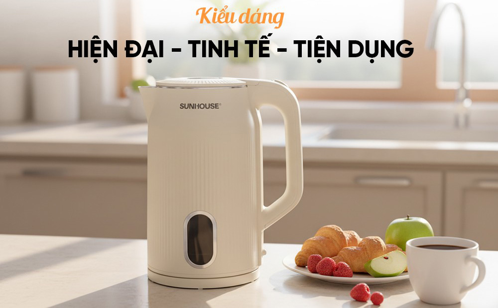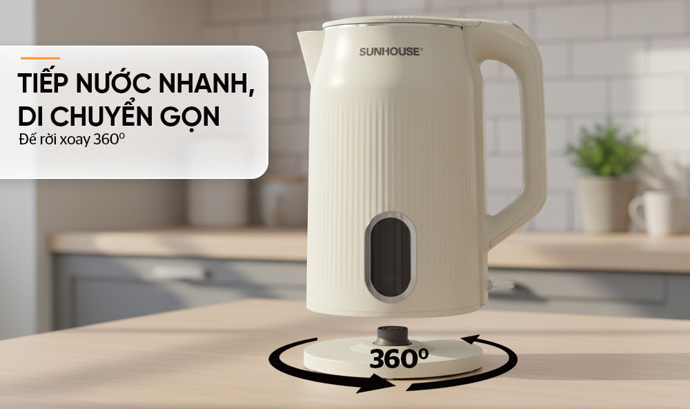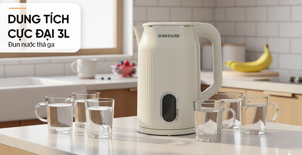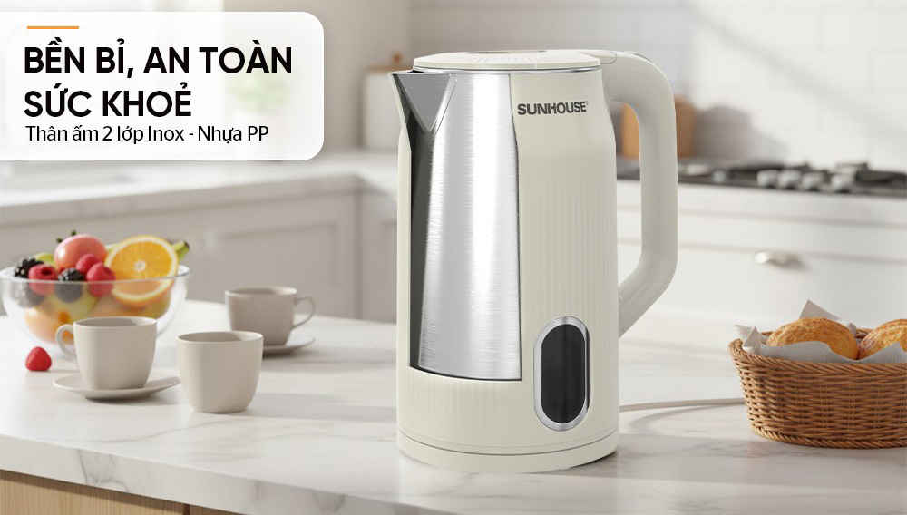 Bình đun siêu tốc inox Sunhouse SHD1365 có dung tích lớn 3 lít cùng công suất 1700W đun nước nhanh sôi, đáp ứng tốt nhu cầu sử dụng của gia đình, văn phòng, quán nước,...