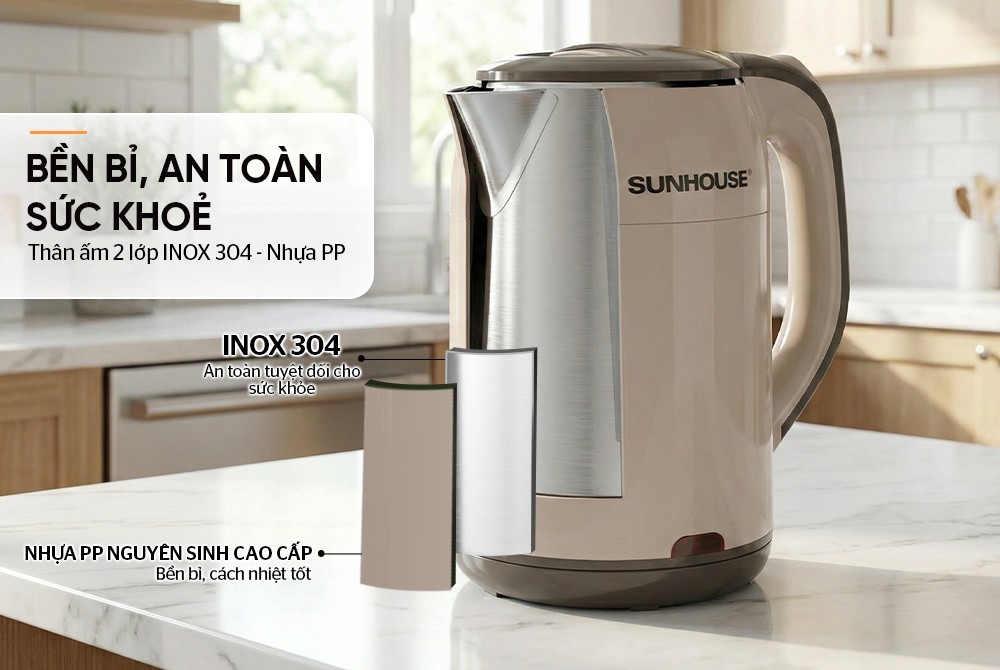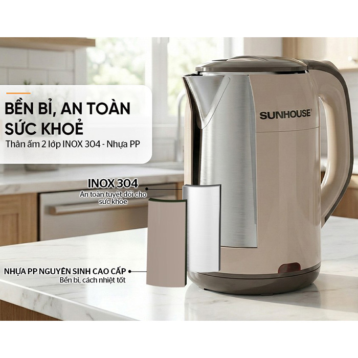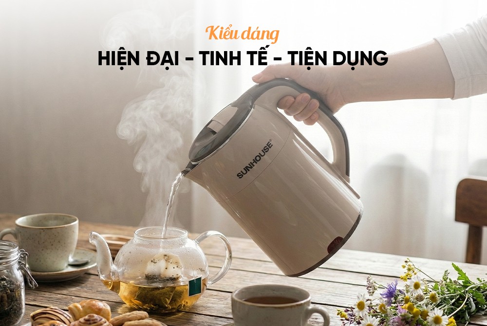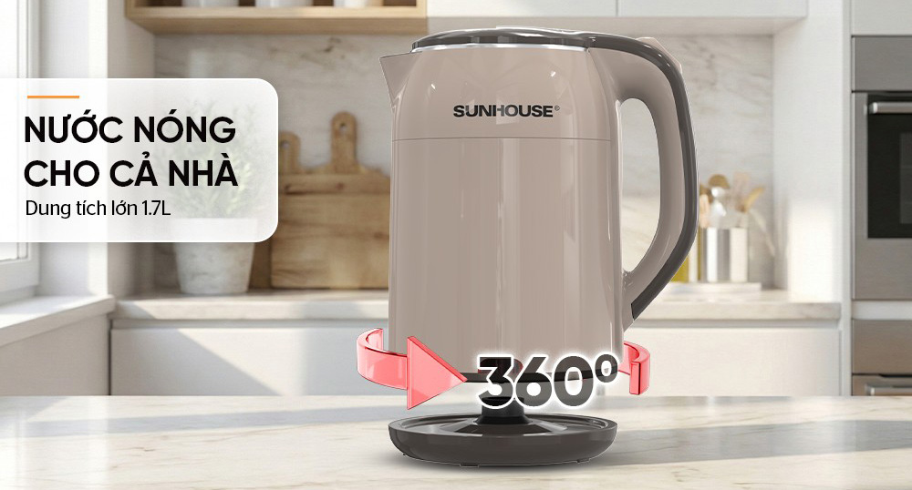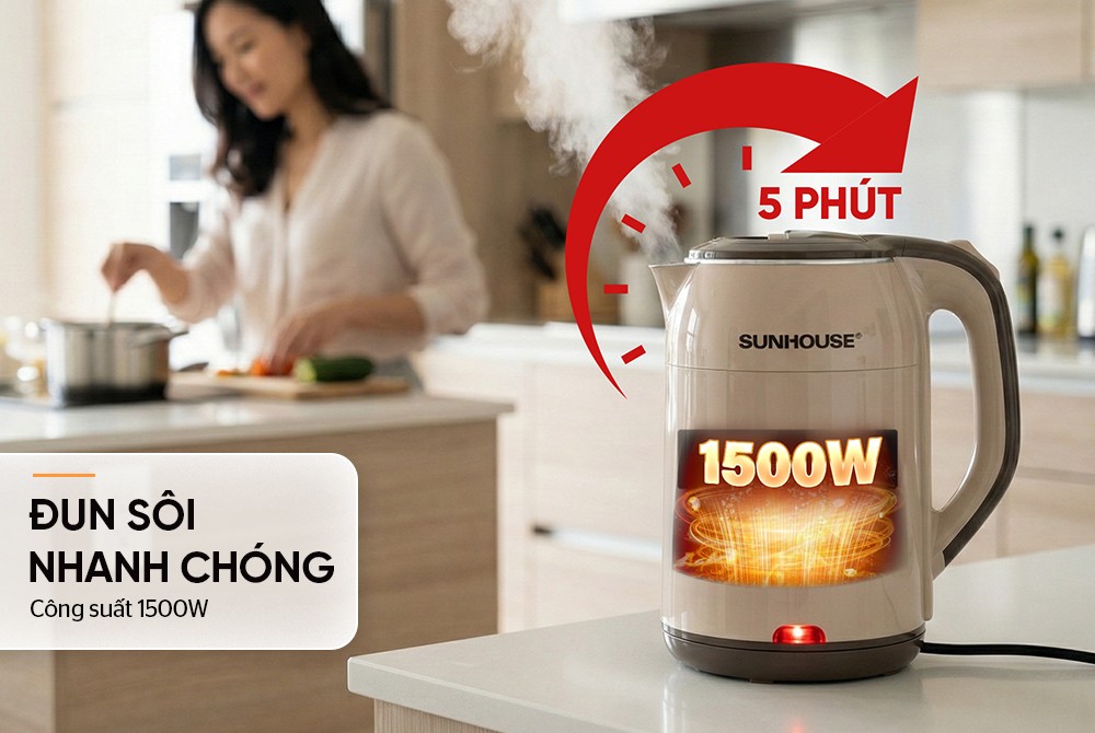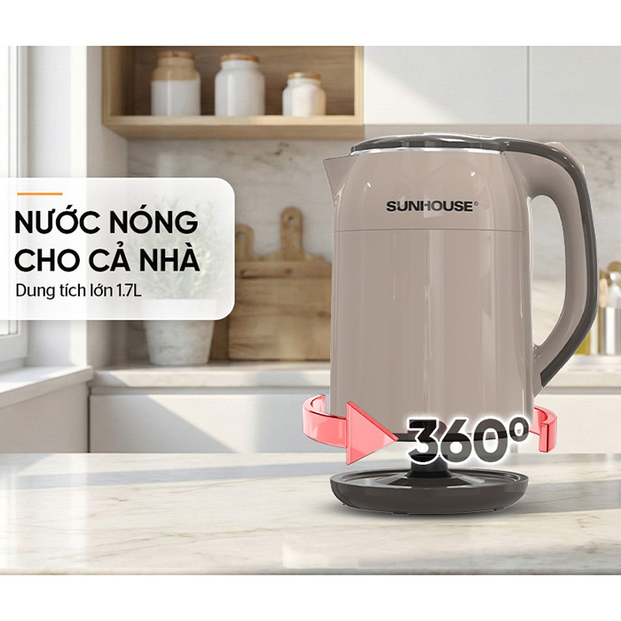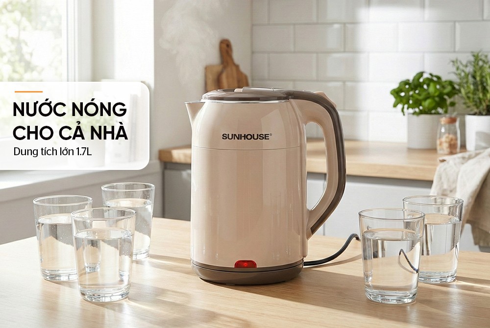 Bình đun siêu tốc inox Sunhouse SHD1359 có dung tích lớn 1.7 lít cùng công suất 1500W đun nước nhanh sôi, đáp ứng tốt nhu cầu sử dụng của gia đình, văn phòng, quán nước,...