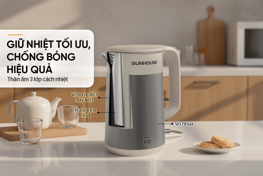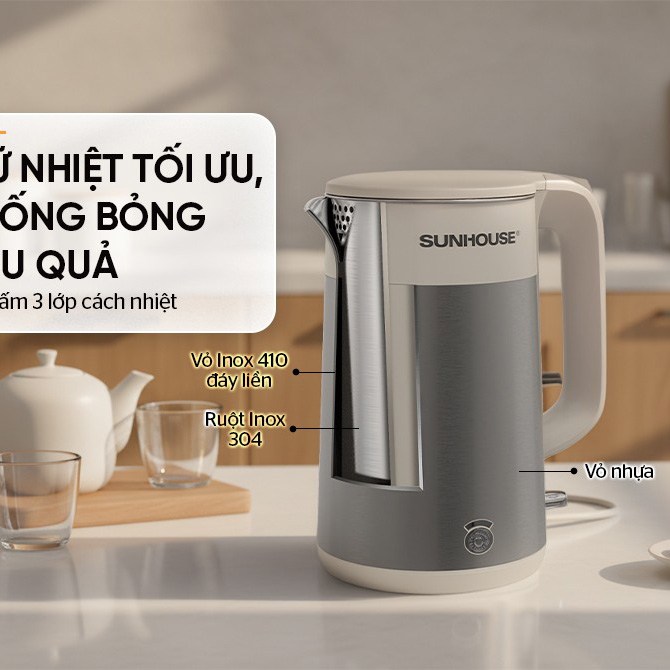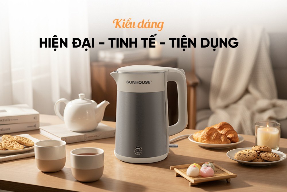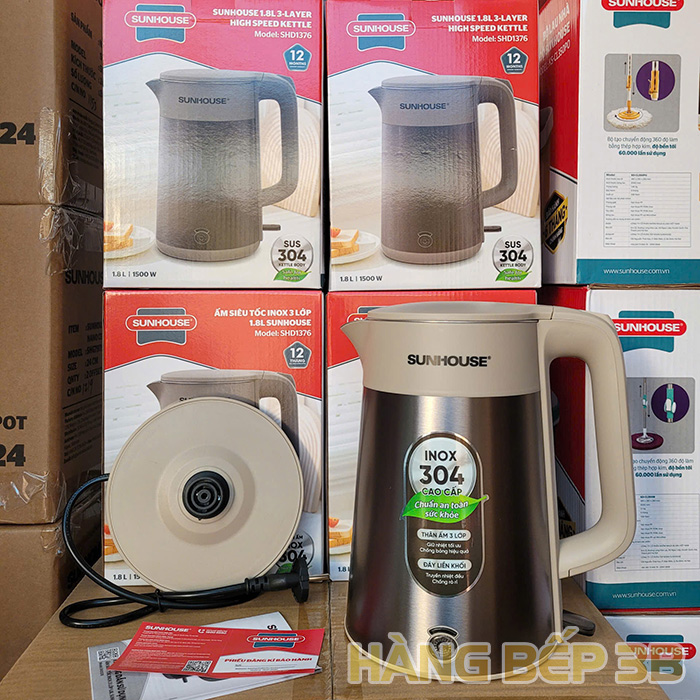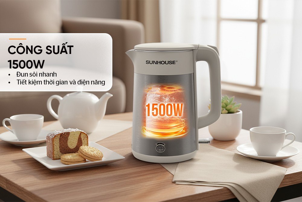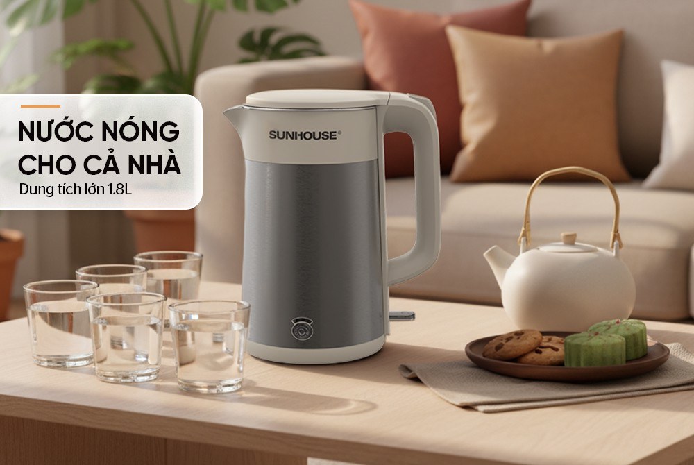 Bình đun siêu tốc inox Sunhouse SHD1376 có dung tích lớn 1.8 lít cùng công suất 1500W đun nước nhanh sôi, đáp ứng tốt nhu cầu sử dụng của gia đình, văn phòng, quán nước,...