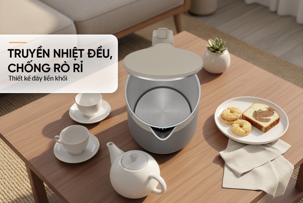 Phần đáy bên trong lòng bình là dạng liền khối dập sâu chắc chắn, đảm bảo khả năng truyền nhiệt nhanh và đồng đều. Với thiết kế này cũng giúp chống rò rỉ nước, tăng độ bền và an toàn cho thiết bị, đặc biệt trong quá trình sử dụng lâu dài.
