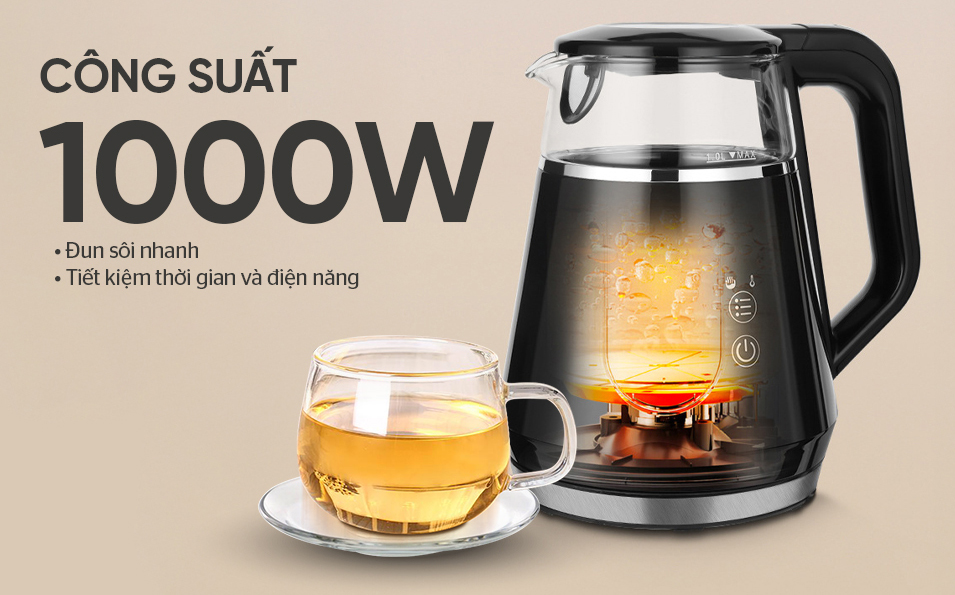 Công suất mạnh 1000W cho thời gian nấu nước nhanh chóng, giúp tiết kiệm điện năng tối đa, đồng thời không sản sinh ra các chất độc hại dưới tác động của nhiệt độ cao.