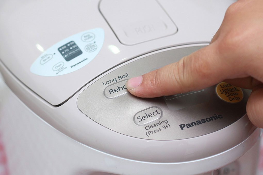 Bình thủy điện Panasonic có bảng điều khiển điện tử với các phím chọn chức năng đun sôi. Bình có 4 nhiệt độ nước 70, 80, 90, 98 độ C.