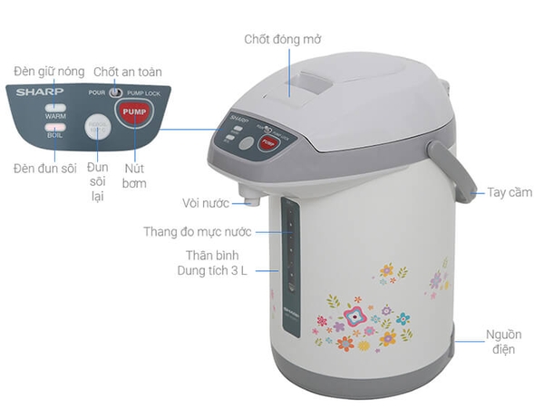 Bình Thủy Điện Sharp KP-Y32PV-CU thiết kế hình trụ thon gọn, sang trọng, thân dày chắc, giữ nhiệt tốt, dung tích 3 lít thích hợp cho gia đình 2 - 4 người dùng.