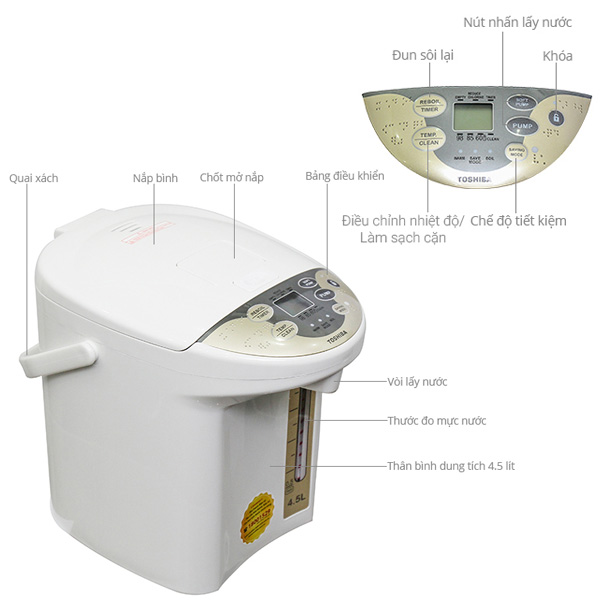 Bình thủy điện Toshiba PLK-45SF(WT)VN kiểu dáng đơn giản, màu trắng trang nhã, phù hợp với mọi không gian. Dung tích 4.5 lít phù hợp sử dụng trong gia đình, văn phòng, quán cà phê,...