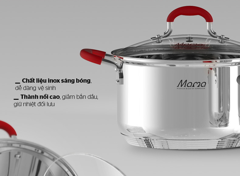 Bộ nồi inox 5 đáy Sunhouse MAMA SHG2503MSD được làm bằng chất liệu inox chất lượng, sáng bóng, dễ vệ sinh. Sản phẩm được thiết kế với kiểu dáng hiện đại, vung kính cường lực viền inox chắc chắn, quai núm tán đinh bọc silicon cách nhiệt hiệu quả.