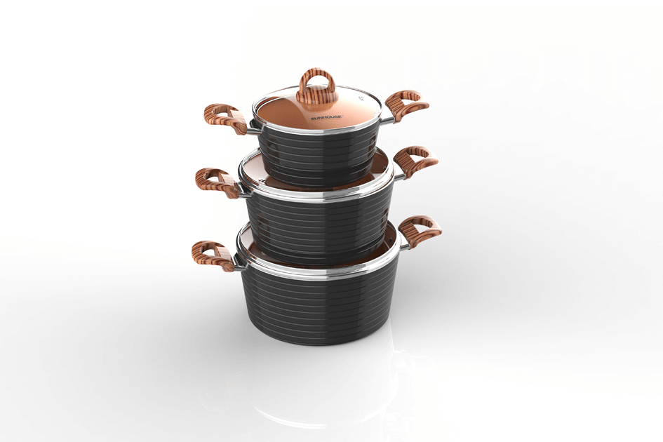 Bộ nồi ceramic đáy từ Sunhouse SHG2003MCA với thiết kế tiện dụng cùng chất liệu đặc biệt sẽ mang đến độ bền và tính thẩm mỹ cao cho căn bếp. Được làm từ nhôm đúc nguyên khối có đáy từ, nồi vừa có độ dẫn nhiệt cao, vừa có thể sử dụng trên các loại bếp từ, bếp hồng ngoại hiện đại để tiết kiệm thời gian nấu nướng. Đồng thời, phần nắp nồi bằng kính cao cấp chịu lực chịu nhiệt tốt, tay cầm và núm vung đều được làm từ chất liệu nhựa phủ silicon chịu nhiệt, chống nóng tay khi sử dụng.