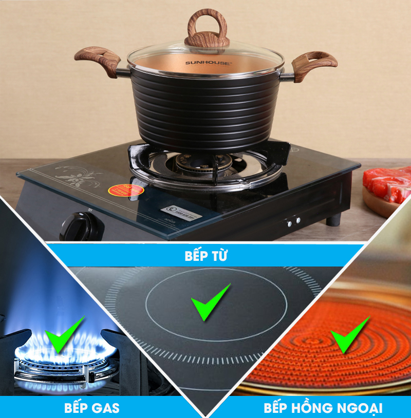 Sử dụng được trên mọi loại bếp: Nồi được cấu tạo đáy từ nên sử dụng được trên mọi loại bếp: bếp từ, bếp gas, bếp hồng ngoại.