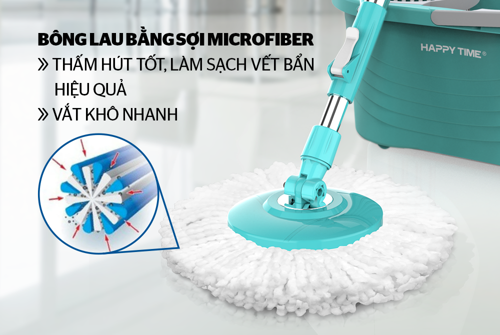 Tấm bông lau bằng sợi Microfiber thấm hút nước tốt, vắt khô khanh có tác dụng lau sạch bụi hiệu quả. Hệ thống vắt khô nước tích hợp gọn và tiện lợi, dễ dàng giặt và vắt khô bông lau.
