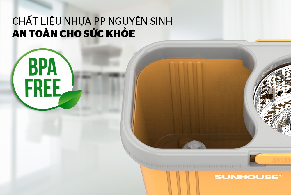 Bộ lau nhà xoay 360 độ SUNHOUSE KS-CL350PO được thiết kế tiện dụng với thùng vắt làm bằng nhựa nguyên sinh PP siêu bền với màu cam bắt mắt. Kích thước phù hợp giúp bạn thoải mái giặt, vắt mà không lo bị bắn nước ra bên ngoài.