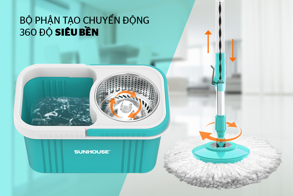 Bộ phận tạo chuyển động với thanh dẫn động xoắn bằng thép hợp kim và cơ cấu tạo chuyển động bằng nhựa POM chống mài mòn tốt cùng hệ thống giảm chấn động bằng cao su giúp tạo chuyển động 360 độ nhẹ nhàng, tăng độ bền sản phẩm (thao tác vắt 60,000 lần). Chỉ cần nhấn cây lau vào thùng giặt hoặc lồng vắt bạn sẽ dễ dàng giặt hoặc vắt khô bông lau.