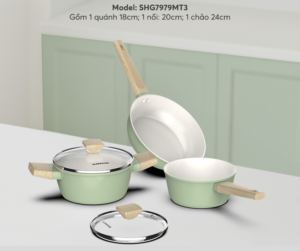 Bộ nồi chảo Sunhouse Healthy SHG7979MT3 khoác lên màu sắc mới tươi tắn, phù hợp với phong cách sống trẻ trung, hiện đại và tinh tế.