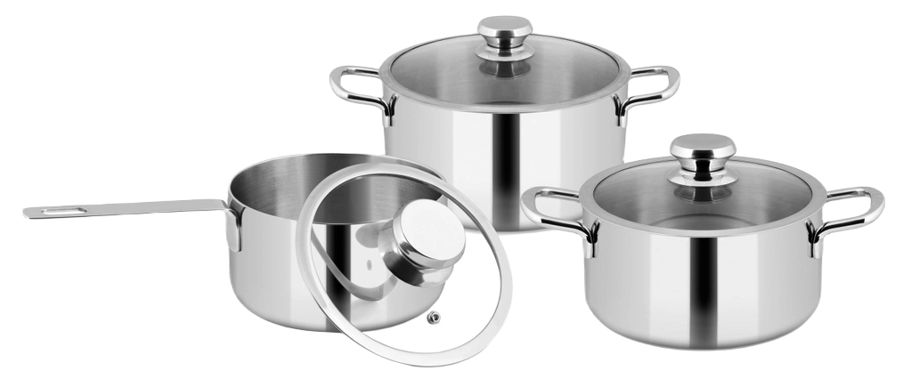 Bộ nồi có cấu tạo đáy 3 lớp truyền nhiệt nhanh, tỏa nhiệt đều và giữ nhiệt tốt. Đặc biệt, có thể dùng với tất cả các loại bếp (bếp điện từ, bếp hồng ngoại, bếp gas,...)