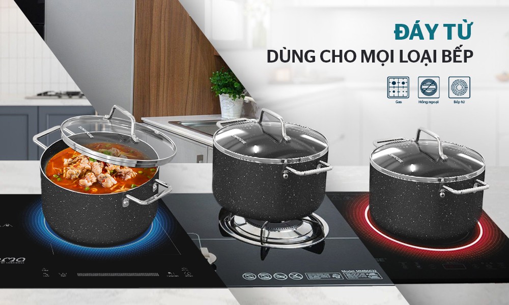 Bộ nồi này có tích hợp đáy từ, tương thích được trên mọi loại bếp, mọi gia đình đều có thể sử dụng được dù nhà bạn đang dùng bếp từ, bếp hồng ngoại hay bếp gas.