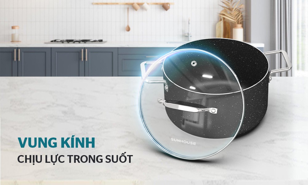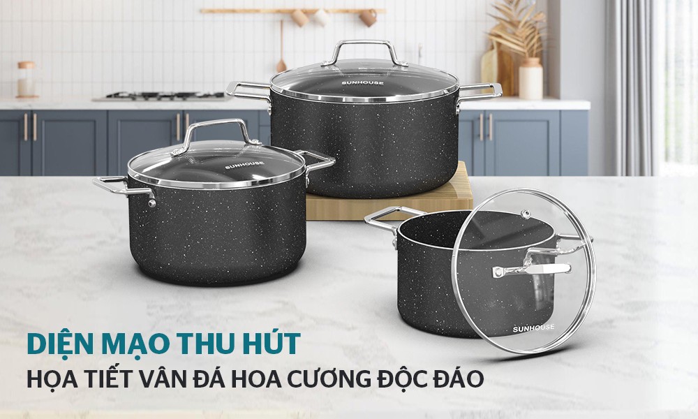 Bộ nồi Sunhouse SHG7878MB siêu bền được trang trí lớp chống dính vân đá hoa cương độc đáo, vừa tạo điểm nhấn cho bộ sản phẩm, vừa hỗ trợ tốt trong việc nấu ăn.