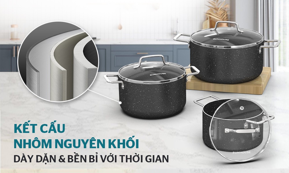 Bộ nồi Sunhouse SHG7878MB gồm 3 kích cỡ 16cm, 20cm và 24cm, được cấu tạo từ nhôm nguyên khối dày dặn, bền bỉ với thời gian. Chất liệu hợp kim nhôm cao cấp với độ dày 2.5mm giúp truyền nhiệt tốt hơn, tiết kiệm nhiên liệu để làm nóng nồi. Đồng thời, nhiệt cung được tỏa đều cho món ngon chín đều và thêm trọn vị.