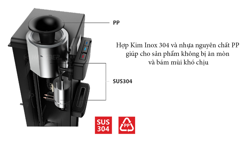- Dung tích bình chứa nước nóng là 0.89 lít, bình chứa nước lạnh là 3 lít. Chất liệu bình chứa nước nóng và lạnh đều làm từ inox 304 an toàn cho sức khỏe.