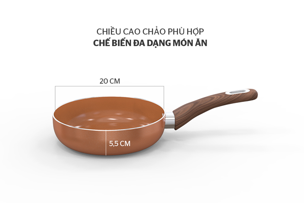 Chảo được thiết kế màu đồng bắt mắt, làm sáng không gian bếp. Bên cạnh đó sản phẩm ít bám dầu được phủ sứ chống dính cao cấp giúp thức ăn không bị dính khi đun nấu, chống bám bụi, dễ dàng vệ sinh.
