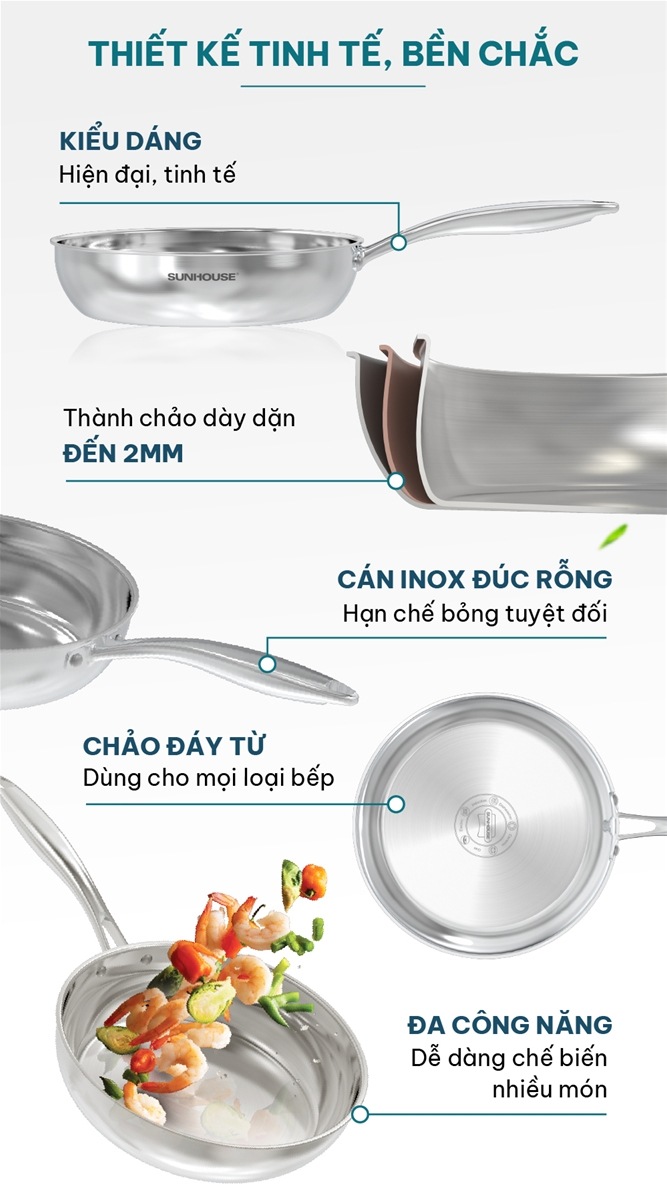 Chảo inox đa lớp Sunhouse IN-M6E được làm từ inox cao cấp bền bỉ và chống han gỉ, chảo có khả năng bắt nhiệt và truyền nhiệt nhanh, tiết kiệm thời gian chế biến món ăn.