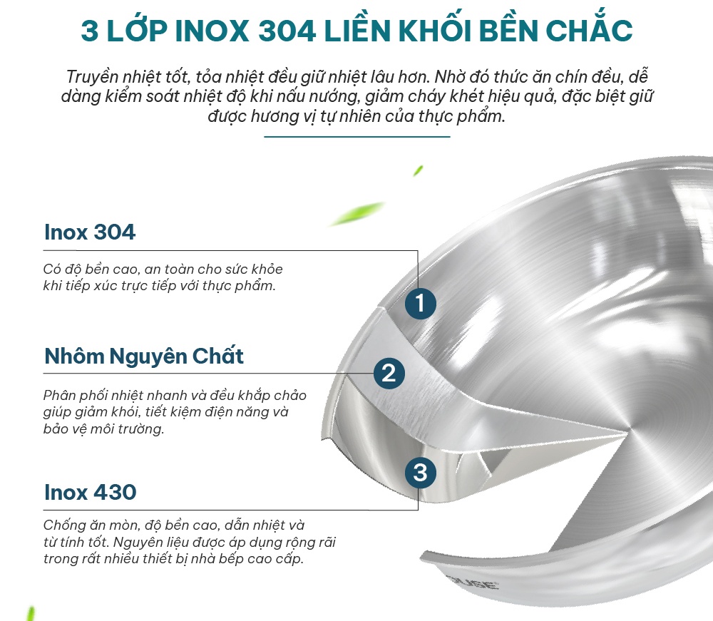 Chảo được cấu tạo bởi 3 lớp inox liền khối bền chắc. Chất liệu cao cấp này đảm bảo an toàn khi tiếp xúc với nhiệt độ cao, không ảnh hưởng đến thực phẩm và sức khỏe người dùng.