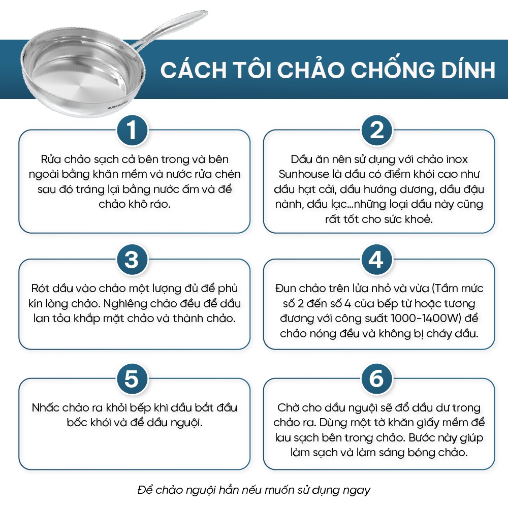 Lòng chảo inox 304 cao cấp, sở hữu lớp chống dính tự nhiên sau khi tôi chảo (xem hướng dẫn bên dưới). Lớp chống dính này sẽ giúp thức ăn không bị dính trong quá trình nấu, bên cạnh đó còn chống bong tróc và dễ dàng vệ sinh.
