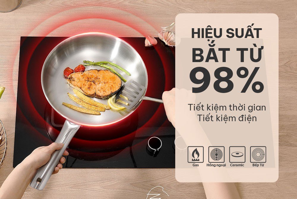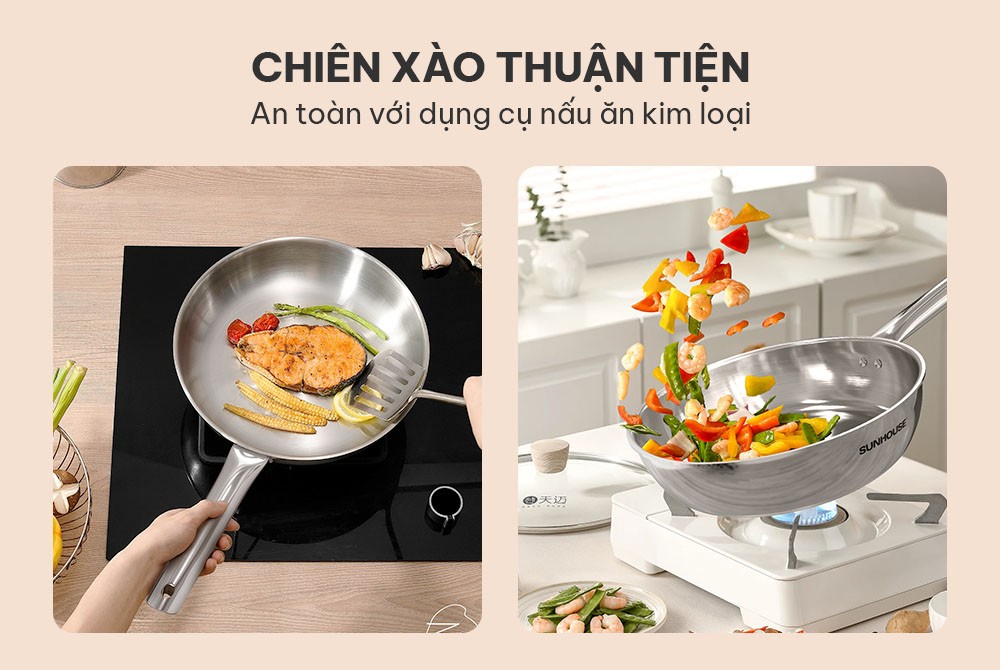 Đáy chảo inox đa lớp Sunhouse có hiệu suất bắt từ tốt nên dùng được trên mọi loại bếp như bếp gas, bếp hồng ngoại, bếp điện từ,...