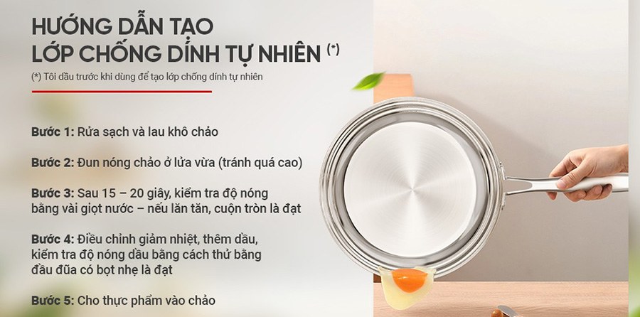 Để tối ưu hiệu quả chống dính tự nhiên và giúp các món chiên xào ngon chuẩn vị, bạn có thể tham khảo cách “tôi chảo” như hình bên dưới.