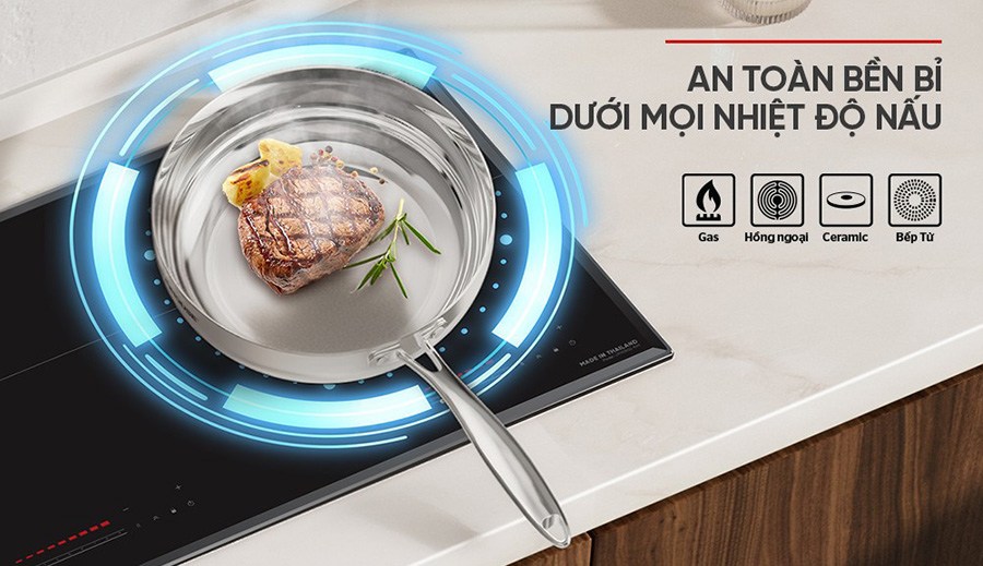 Đáy chảo inox 430 có hiệu suất bắt từ tốt nên dùng được trên mọi loại bếp như bếp gas, bếp hồng ngoại, bếp điện từ. Điều này mang lại sự linh hoạt và thuận tiện cho người sử dụng, dù gia đình bạn sử dụng loại bếp nào thì chảo vẫn đáp ứng tốt công năng của mình.