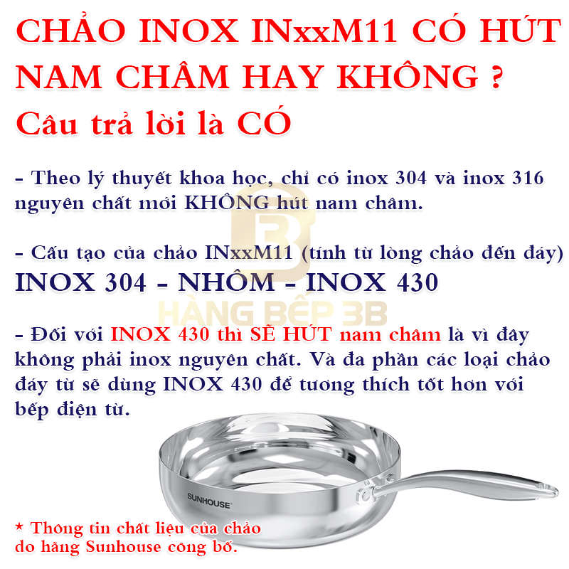 | Chất liệu thân chảo | Inox 304 - Nhôm - Inox 430 tính từ lòng chảo ra bên ngoài |