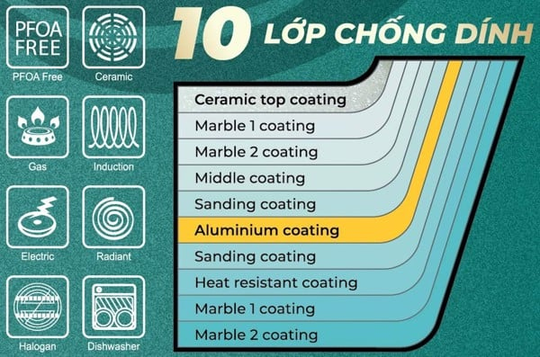 Lòng chảo dày dặn 10 lớp chống dính giúp việc nấu ăn dễ dàng hơn. Ngoài ra còn hạn chế trầy xước, tăng tuổi thọ của chảo.