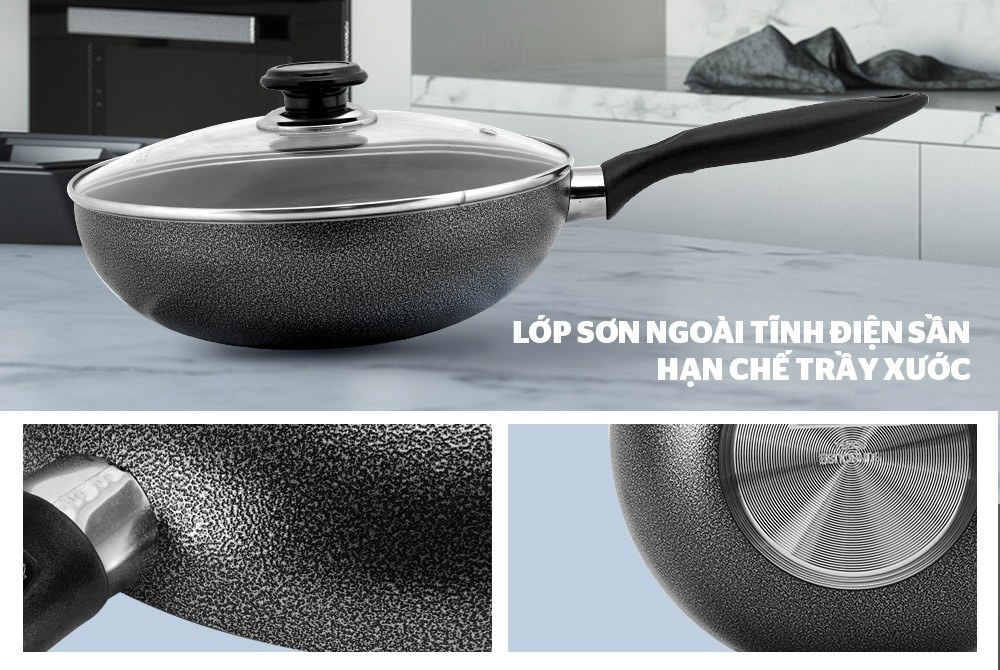 Lòng chảo được phủ 3 lớp chống dính cao cấp, thức ăn sẽ không bị dính trong quá trình nấu, bên cạnh đó còn chống bong tróc và dễ dàng vệ sinh.