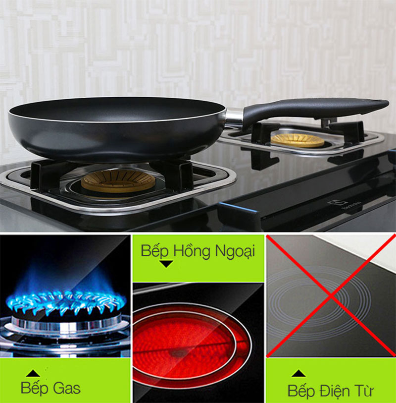 Chảo chiên chống dính Sunhouse CT24 có thể dùng được trên bếp gas, bếp hồng ngoại, không dùng trên bếp từ.