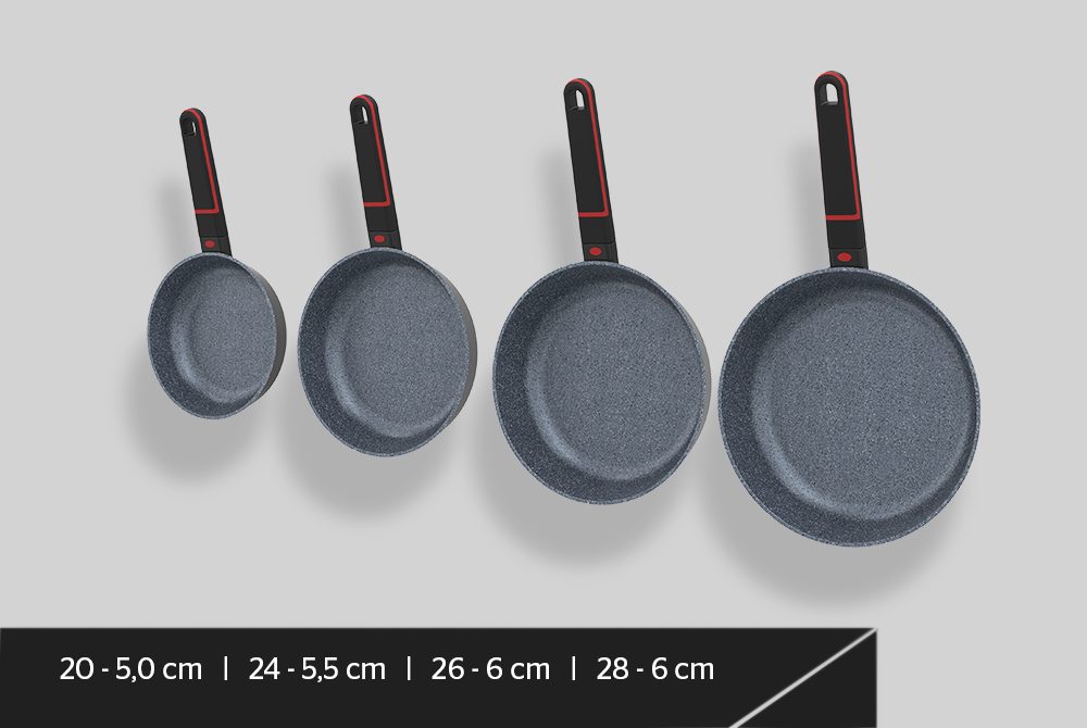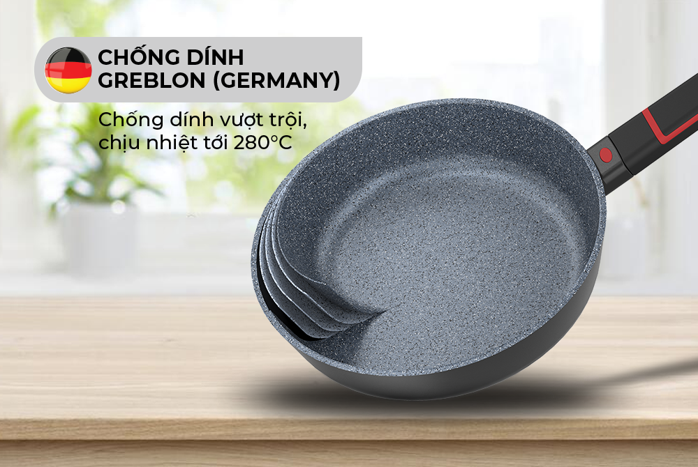 Chảo có 4 đường kính 20cm, 24cm, 26cm và 28cm dễ dàng đáp ứng nhiều nhu cầu chiên xào khác nhau. Thành chảo dày được sơn chịu nhiệt kỹ càng, tỷ mỹ, lòng chảo phủ 5 lớp chống dính Greblon (Đức) chịu được nhiệt độ cao, an toàn tối đa cho sức khỏe của Bạn và gia đình.