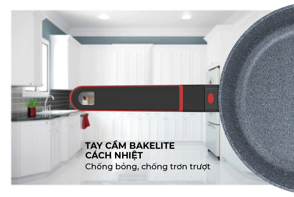 Cán chảo chống nóng, bọc silicon êm ái có thể cầm nắm di chuyển trong quá trình nấu nướng. Cùng với đó tay cầm cũng được trang trí với đường viền ABS màu đỏ tạo nên vẻ đẹp mới mẻ và nổi bật.