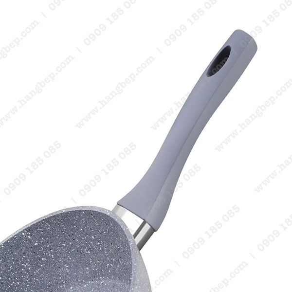 Cán chảo bằng nhựa cách nhiệt, chống nóng khi cầm. Phần cuối có thiết kế thêm lỗ để treo chảo, tiết kiệm diện tích cho căn bếp.