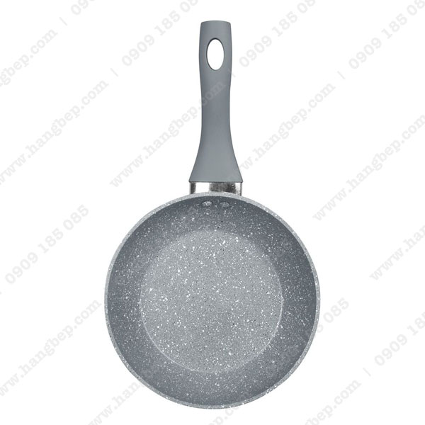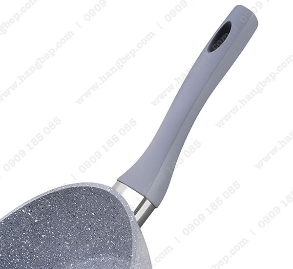 Cán chảo bằng nhựa cách nhiệt, chống nóng khi cầm. Phần cuối có thiết kế thêm lỗ để treo chảo, tiết kiệm diện tích cho căn bếp.