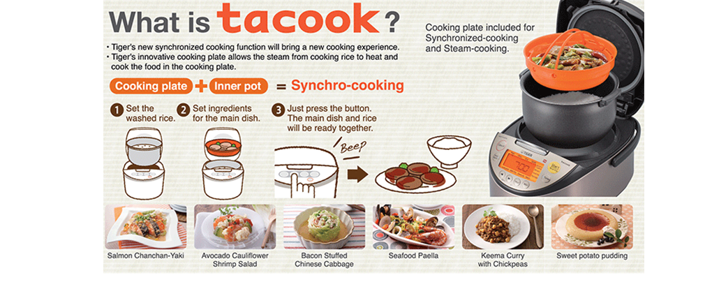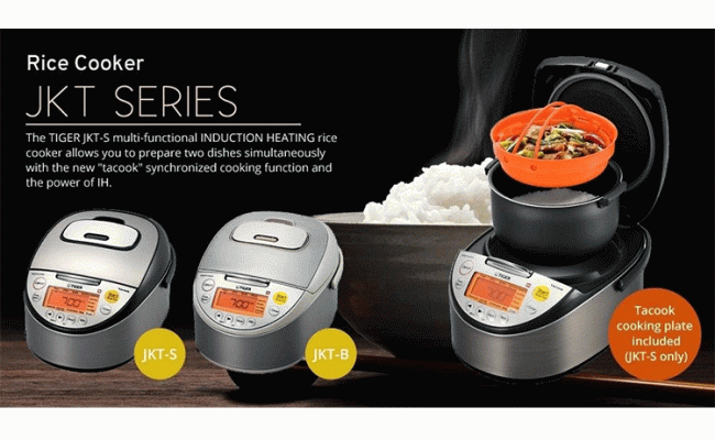 Nồi cơm điện tử cao tần Tiger JKT-S10W với chức năng nấu “Tacook” công nghệ mới chỉ được tích hợp trên những nồi cơm điện tử cao cấp để vừa nấu cơm và vừa nấu thức ăn cùng một lúc giúp bạn tiết kiệm nhiều thời gian cho công việc nội trợ. Lưu ý : Loại gạo không vo nấu được ở chế độ nấu gạo trắng, nấu cơm cực ngon, nấu tiết kiệm điện, nấu cơm nhanh, nấu gạo nếp – nấu cơm trộn, nấu cháo, nấu đồng thời (Tacook).