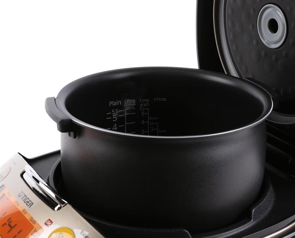 Nồi cơm điện tử cao tần Tiger JKT-S10W với công nghệ xử lý bằng vi mạch điện tử tự động thực hiện ngâm gạo trong nước nóng trong vòng 15 – 20 phút trước khi nấu cho hạt cơm ngon hơn cũng như cho phép bạn tinh chỉnh thời gian để nấu cháo, hầm, hấp. Ngoài ra, thang đo quy định tối đa và tối thiểu mực nước tương ứng với lượng gạo nấu và chế độ nấu được khắc trong lồng nồi giúp bạn dễ dàng, thuận tiện đo lường lượng gạo và nước phù hợp khi nấu cơm.