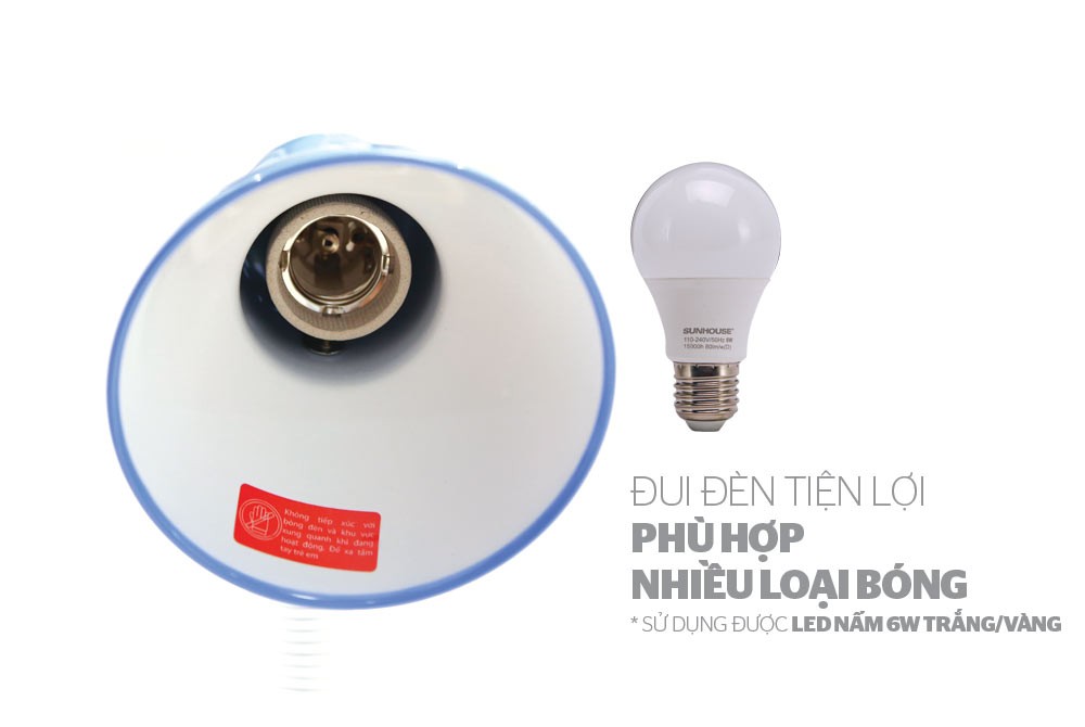 Đặc biệt đui đèn là loại E27 phổ biến trên thị trường (đèn dây tóc, đèn led....) có thể mua và thay thế dễ dàng. Đui bóng làm bằng sứ chịu nhiệt, sử dụng lâu không nóng hạn chế cháy nố và góp phần tăng tuổi thọ bóng.