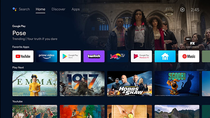 Thiết lập hệ điều hành Google TV với giao diện màn hình hiện đại, cho người dùng quan sát, lựa chọn và truy cập vào các nội dung giải trí linh hoạt. Kho ứng dụng đa dạng với nhiều ứng dụng phổ biến như YouTube, Netflix, Prime Video,...