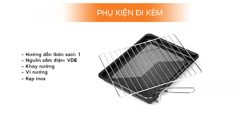 | Phụ kiện đi kèm | Khay nướng Vỉ nướng Kẹp inox Thanh xiên inox |