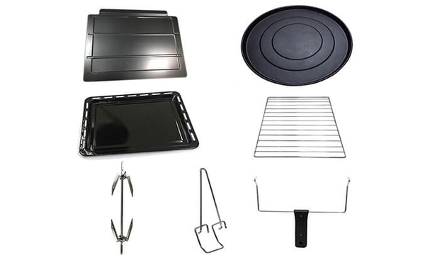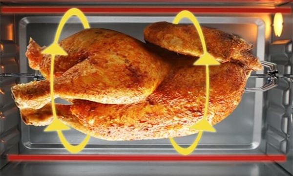Lò nướng kết hợp dàn nướng trên và dưới với 12 chức năng nướng hoàn hảo. Nướng đối lưu với hệ thống quạt đối lưu trong lò giúp lưu thông khí nóng làm cho thực phẩm chín đều và giòn. Cơ chế quay đều giúp gà, vịt quay chín vàng.