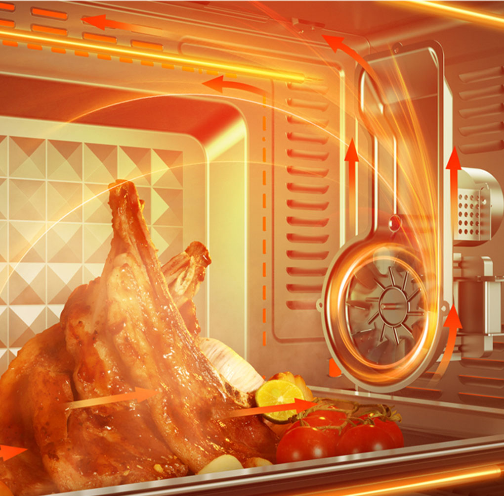 Hương vị thơm ngon và lớp vàng nâu trên bề mặt thực phẩm được đảm bảo hơn nữa nhờ quạt đối lưu luân chuyển không khí nóng bên trong khoang, giúp bọc thực phẩm chín đều và nhanh chóng.