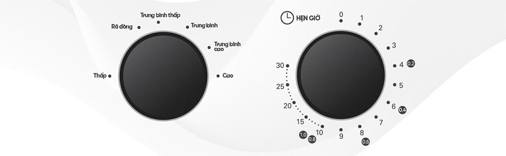 Bảng điều khiển gồm 2 núm vặn xoay (mức công suất & hẹn giờ hoạt động) được thể hiện rõ và dễ nhìn bằng ngôn ngữ tiếng Việt giúp cho ai cũng có thể sử dụng được.