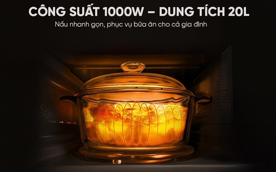 Lò vi sóng với dung tích 20 lít cùng công suất 1000W thoải mái hâm nóng, rã đông và nấu mọi loại thức ăn.