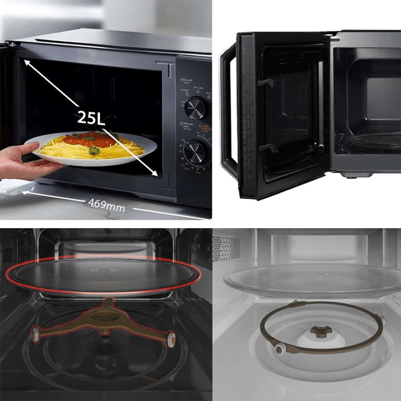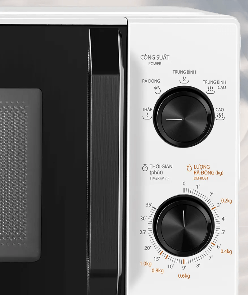 Lò vi sóng với dung tích 25 lít cùng công suất 800W thoải mái hâm nóng, rã đông và nấu mọi loại thức ăn với dải nhiệt độ rộng 5 mức.