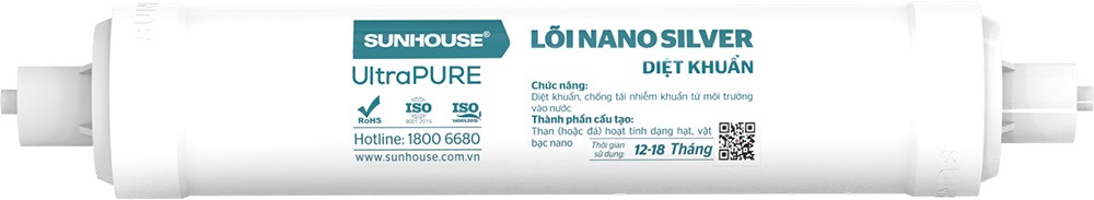 Lõi diệt khuẩn Sunhouse Nano Silver SHA-WFSIL cấu tạo từ than (đá) hoạt tính dạng hạt và vật liệu phủ bạc nano. Chức năng diệt khuẩn và chống tái nhiễm khuẩn từ môi trường vào nước.