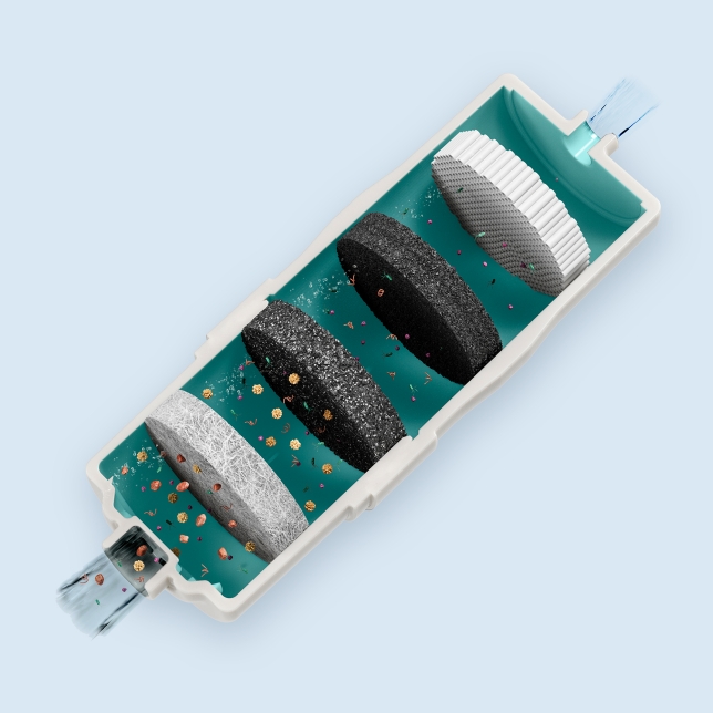 Các bộ lọc được làm từ bốn loại vật liệu với kích thước lỗ khác nhau: Vải không dệt, gốm, than hoạt tính và màng sợi rỗng loại Siêu lọc.