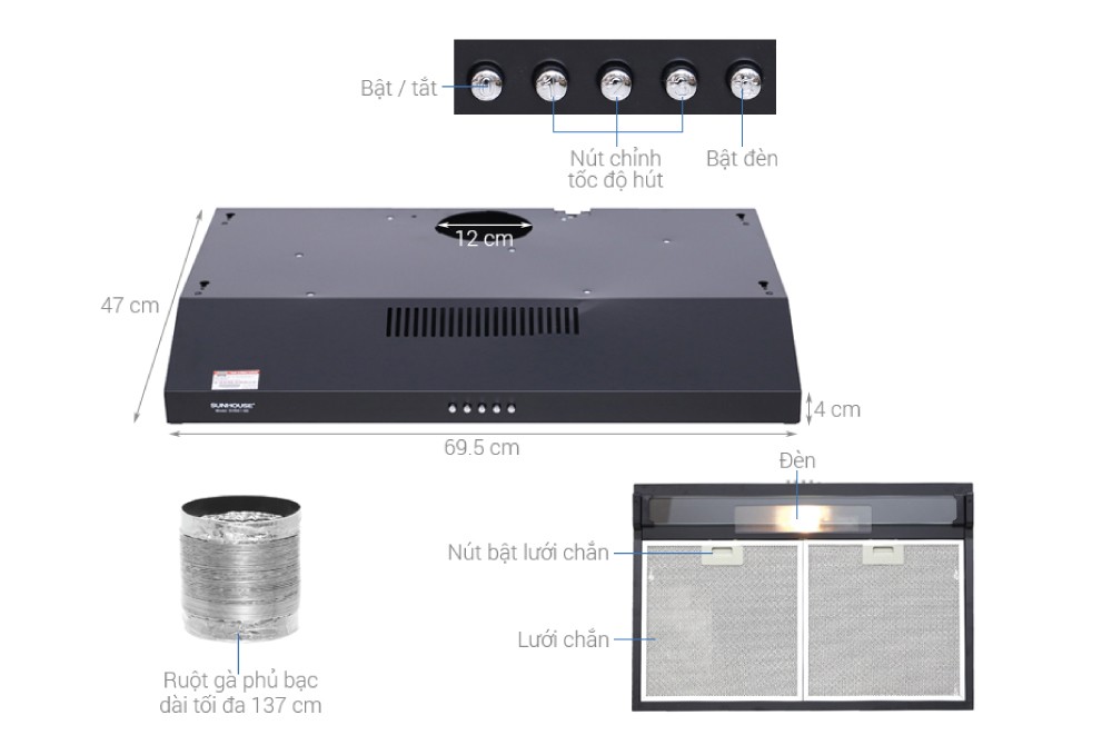 | Tiện ích | 3 mức công suất dễ dàng điều chỉnh Đèn sợi đốt công suất cao, chiếu sáng tốt Lưới lọc bằng nhôm dày dặn có độ bền cao |
